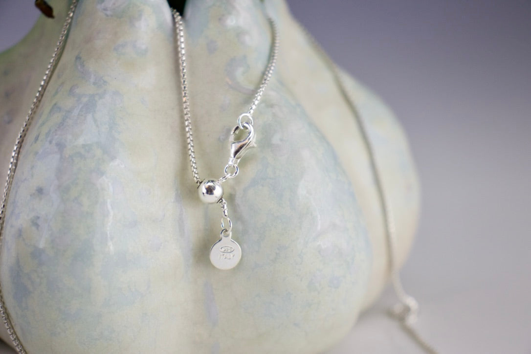 Adjustable sterling chain is optional, at it's largest it is 22" long but will slide smaller to be the perfect length for your chosen neckline.